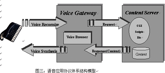 語(yǔ)音應(yīng)用協(xié)議(VAP VA)定義了終端--?網(wǎng)關(guān)--?服務(wù)器的體系結(jié)構(gòu)。語(yǔ)音服務(wù)器(Voice Server )是語(yǔ)音應(yīng)用的服務(wù)器,其包含語(yǔ)音應(yīng)用和數(shù)據(jù)、內(nèi)容;與WAP體系結(jié)構(gòu)不同的是,語(yǔ)音網(wǎng)關(guān)(Voice Gateway) 做為終端和語(yǔ)音應(yīng)用服務(wù)器的橋梁,作為語(yǔ)音應(yīng)用協(xié)議中的重要部分:語(yǔ)音瀏覽器(Voice Browser)建于語(yǔ)音網(wǎng)關(guān)(Voice Gateway)內(nèi),而不象WAP協(xié)議中,micro browser 建于終端中。這是因?yàn)檎Z(yǔ)音終端過(guò)于簡(jiǎn)單以及語(yǔ)音數(shù)據(jù)可以通過(guò)電信網(wǎng)絡(luò)輕松與語(yǔ)音網(wǎng)關(guān)(Voice Gateway)交互。
