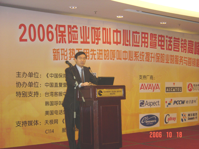 。。2006年10月18日,2006保險業(yè)呼叫中心應(yīng)用暨電話營銷高峰研討會在北京天鴻科園大酒店隆重召開,以下是大會開幕致辭的相關(guān)圖片報道: