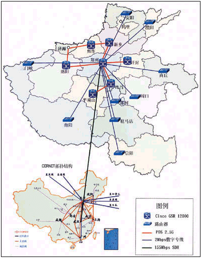 河南省教育科研計算機(jī)網(wǎng)(HERNET)作為中國教育科研計算機(jī)網(wǎng)絡(luò)(CERNET)在河南的省級網(wǎng)絡(luò),提供河南省的教育與科研機(jī)構(gòu)的Internet接入。在CERNET業(yè)已發(fā)展成為中國第二大互聯(lián)網(wǎng)的今天,各省教研網(wǎng)的建設(shè)變得尤為重要,河南省在2001年啟動“教育信息化年”規(guī)劃后,多方合作,采用思科系統(tǒng)(中國)網(wǎng)絡(luò)技術(shù)有限公司的高端網(wǎng)絡(luò)設(shè)備,將原來骨干帶寬僅為2M的教育科研網(wǎng)升級到2.5G,順利實現(xiàn)了教育科研網(wǎng)絡(luò)應(yīng)用的飛躍性進(jìn)步,并且真正實現(xiàn)了“三網(wǎng)合一”。