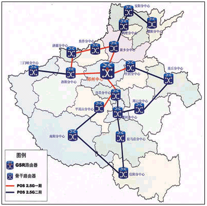 HERNET一期工程主干網(wǎng)采用IP POS技術(shù),應(yīng)用AVVID網(wǎng)絡(luò)體系結(jié)構(gòu),采用骨干傳輸網(wǎng)、城域網(wǎng)、接入網(wǎng)三層設(shè)計方案,以省網(wǎng)絡(luò)中心(設(shè)在鄭州大學(xué)網(wǎng)絡(luò)中心)、地市網(wǎng)絡(luò)中心、校園網(wǎng)三級管理模式。由省網(wǎng)絡(luò)中心向下以2.5G速度連接到各地市網(wǎng)絡(luò)中心,而向上則以155M速度連接到CERNET及Internet。整個一期工程實現(xiàn)了包括鄭州、許昌、平頂山、開封、洛陽、濟(jì)源、焦作以及新鄉(xiāng)等7個地市的2.5G連接,并形成了一個環(huán)網(wǎng)狀冗余拓?fù)浣Y(jié)構(gòu),確保當(dāng)網(wǎng)絡(luò)的一個節(jié)點出現(xiàn)問題時,數(shù)據(jù)可以通過其他途徑傳輸?shù)侥康牡,在一期工程完成后,?0多所大學(xué)、中小學(xué)等教育與科研單位以千兆速度連接到HERNET上,共有近50萬的用戶能夠充分利用高速帶寬獲得教育網(wǎng)資源。