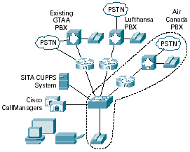 航空公司的撥號計劃——該機場正在為各個航空公司部署不同的分區(qū)和撥號計劃。在缺省情況下,GTAA域中有五個數(shù)字撥號,但是當(dāng)每個航空公司登陸到登機口時,他們希望從他們自己的PBX或者Centrex電話系統(tǒng)獲取線路。這意味著各個航空公司可能擁有重復(fù)的電話號碼,以及關(guān)于哪些電話可以呼叫哪些目的地的不同規(guī)則。這些計劃還包括利用IP技術(shù),與已經(jīng)在兩年前部署思科IP電話的AC