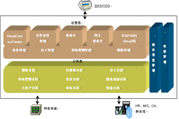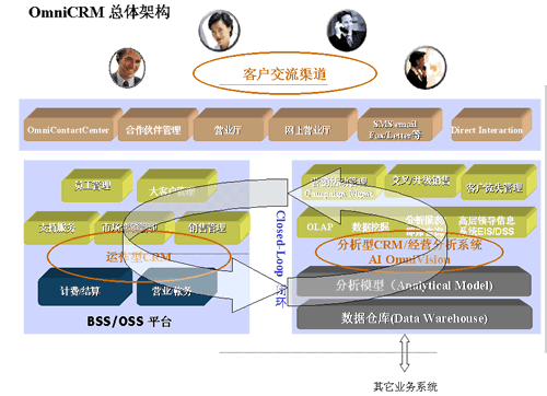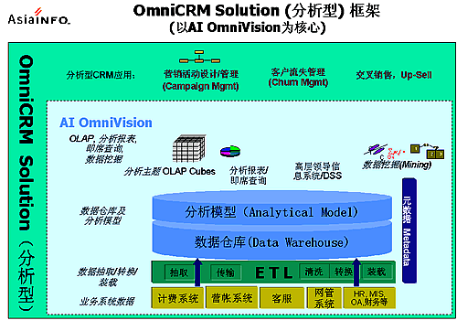 OmniCRM方案是亞信基于多年服務(wù)電信市場的豐富的行業(yè)經(jīng)驗(yàn),以及對國內(nèi)運(yùn)營商業(yè)務(wù)發(fā)展的深刻認(rèn)識而推出的,其中,AI OmniVision是OmniCRM方案中經(jīng)營分析型CRM 的核心產(chǎn)品。AI OmniVision不僅符合行業(yè)業(yè)務(wù)規(guī)范,而且基于對客戶行為、競爭環(huán)境,商業(yè)獲利率以及其他參數(shù)的透徹分析,能夠使運(yùn)營商充分了解現(xiàn)有客戶、識別并關(guān)注贏利的客戶組、提高服務(wù)質(zhì)量、確?蛻魸M意度和忠誠度;同時(shí)吸引潛在的客戶;加強(qiáng)提供新服務(wù)的投資回報(bào)率;提高效率、減小成本,以實(shí)現(xiàn)業(yè)務(wù)價(jià)值的最大化。AI OmniVision采用數(shù)據(jù)倉庫、ETL、OLAP分析、靈活報(bào)表展現(xiàn)及數(shù)據(jù)挖掘等技術(shù),包含了用戶分析、業(yè)務(wù)分析、收益分析、大客戶分析、營銷分析、競爭分析、服務(wù)質(zhì)量、新業(yè)務(wù)分析等眾多功能模塊。