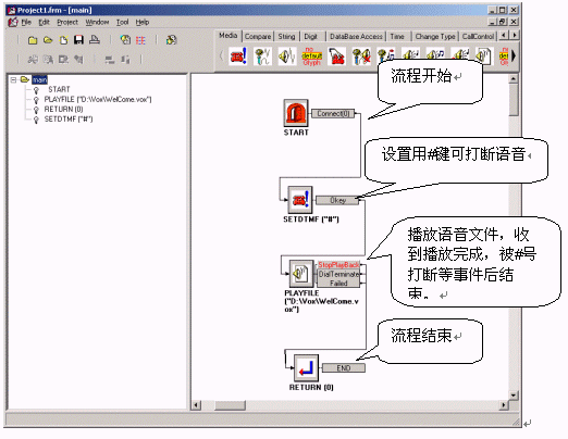 速能呼叫中心中間件的IVR流程開發(fā)接口簡單易學,編寫人員并不需要了解底層的實現(xiàn)原理、Dialogic硬件等知識,而將精力完全放在業(yè)務開發(fā)上即可。