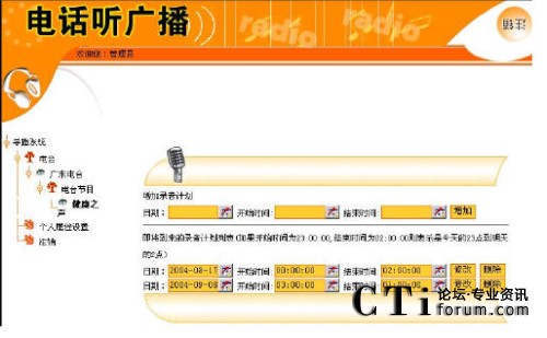 定制自動(dòng)聽(tīng)廣播的目的是:用戶設(shè)定的時(shí)間到達(dá)時(shí),由系統(tǒng)主動(dòng)呼叫用戶所定制的電話,用戶摘機(jī)即可收聽(tīng)到所定制的廣播節(jié)目?jī)?nèi)容。用戶要獲取該自動(dòng)服務(wù)的前提是,必須預(yù)先定制好外呼時(shí)間、外呼電話和廣播內(nèi)容。