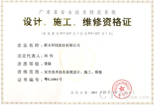 CTI論壇(ctiforum)12月21日消息(記者 張潔):2011年12月,新太科技再傳喜訊,公司順利通過廣東省公安廳認(rèn)定的“廣東省安全技術(shù)防范系統(tǒng)設(shè)計、施工、維修一級資格證”換證審核,成功獲得新證書。