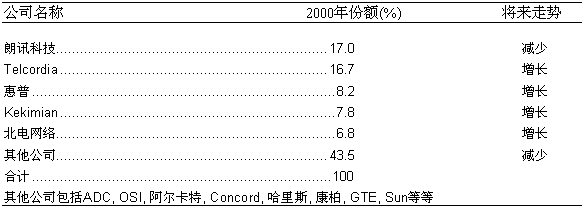 從目前市場情況來看,美國的固定網(wǎng)OSS服務(wù)保障的市場集中度相當(dāng)高。在市場中領(lǐng)先的公司一共有5家,它們分別是朗訊科技、Telcordia科技、惠普公司、Hekimian和北電網(wǎng)絡(luò)。這五家公司均是較早進(jìn)入這一市場的老牌公司。2000年,它們在固定網(wǎng)OSS服務(wù)保障領(lǐng)域的銷售額總和為8.60億美元,約占整個(gè)市場的56.5%左右,另外43.5%的市場被約其他二十多家廠商分割。