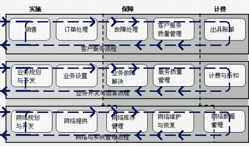 由于是從技術(shù)的角度出發(fā),國(guó)內(nèi)在介紹OSS的時(shí)候,是以實(shí)施、保障和計(jì)費(fèi)縱向的角度介紹的,而當(dāng)我們認(rèn)真地考察TOM圖時(shí)會(huì)發(fā)現(xiàn),OSS最大的意義是橫向的,即從橫向看的TOM圖的每一層,正好構(gòu)成一個(gè)完整的業(yè)務(wù)循環(huán),從上到下依次為:客戶服務(wù)流程、運(yùn)營(yíng)流程和系統(tǒng)管理流程。電信企業(yè)只有按照TOM圖來(lái)規(guī)劃自己的業(yè)務(wù)部門(mén)劃分和相互銜接,才能最大限度地利用OSS所能提供的支持。而現(xiàn)有運(yùn)營(yíng)商的部門(mén)設(shè)置都仍是縱向劃分的,要轉(zhuǎn)成按流程橫向劃分,必須要對(duì)電信運(yùn)營(yíng)管理有深入了解。國(guó)內(nèi)介紹OSS的企業(yè)大都是系統(tǒng)集成商,不懂電信運(yùn)營(yíng),同時(shí)為了自己銷(xiāo)售的需要,都是從技術(shù)的角度縱向介紹,更進(jìn)一步加大了運(yùn)營(yíng)商利用OSS體系實(shí)現(xiàn)管理轉(zhuǎn)型的難度。