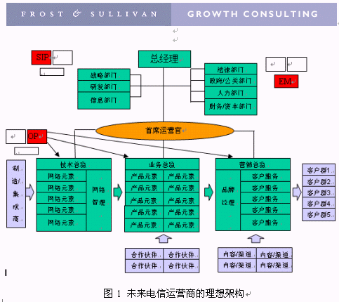 Frost & Sullivan(中國)公司深入研究國際主流運(yùn)營商的組織結(jié)構(gòu)與管理模式,同時參考了國際上公認(rèn)的eTOM模型,并結(jié)合國內(nèi)電信運(yùn)營商組織結(jié)構(gòu)的現(xiàn)狀,提出了圖1所示的未來電信運(yùn)營商的理想架構(gòu)。理想架構(gòu)的確定對電信運(yùn)營管理的變革具有重要的意義。只有事先明確了方向,并且對未來達(dá)成了廣泛一致的共識,才能對目標(biāo)過程進(jìn)行分解,有步驟、有方法、有成效的完成目標(biāo)。