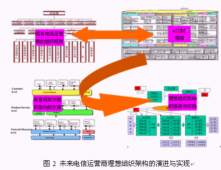 現(xiàn)有的電信運(yùn)營商的管理架構(gòu)向理想的管理組織架構(gòu)演進(jìn)過程中,要涉及到不同的中間過程和步驟,對中間過渡狀態(tài)的評估和有效實(shí)現(xiàn),是實(shí)現(xiàn)演進(jìn)的關(guān)鍵,F(xiàn)有組織架構(gòu)管理職能的對應(yīng),業(yè)務(wù)流程的標(biāo)準(zhǔn)化,管理流程的標(biāo)準(zhǔn)化,企業(yè)IT支撐架構(gòu)對業(yè)務(wù)職能部門的支撐,這些環(huán)節(jié)都是運(yùn)營商應(yīng)該重點(diǎn)考慮的中間內(nèi)容。圖2顯示了未來電信運(yùn)營商理想組織架構(gòu)的演進(jìn)與實(shí)現(xiàn)過程。其中的任何一個環(huán)節(jié)都是電信運(yùn)營管理研究的核心課題,也直接影響到了電信運(yùn)營管理變革的成敗。
