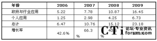 如圖1所示,Frost & Sullivan認為,由于個人應用領域的商業(yè)模式還未成熟,產業(yè)鏈整合仍在進行中,目前移動位置服務應用仍然以政府和企業(yè)應用為主。如圖4所示,2009年個人應用市場規(guī)模為6.73億元,而政府與行業(yè)應用市場達到16.45億元,兩者總計達23.18億元,同比去年增長了53.3%。