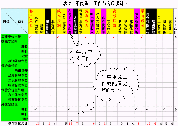 在這里,我們先以崗位設(shè)計來舉例。經(jīng)常有呼叫中心主管把每個崗位的職責都設(shè)計的非常詳細,包括了每天來做什么,說什么,錄入什么,甚至是打掃某區(qū)域衛(wèi)生之類。但是,我看遍了每一條,也沒找到這個崗位應(yīng)該對什么業(yè)績"負責任",該對哪些工作做出貢獻。此處建議各位把效益評價體系、年度重點工作與崗位設(shè)計結(jié)合起來。如表2所示,我們可以把效益評價體系作為KPI放在橫坐標中,而崗位設(shè)置則是縱坐標。每個崗位對應(yīng)的行中,可以勾畫其應(yīng)負責或者做出主要貢獻的項目。這些項目不能超過6個,因為太多的項目會使得這個崗位無所適從,最終的結(jié)果是哪個也沒做好。當你勾畫完成之后,請計算每列的"對勾"數(shù)目,看看你本年度的重點工作是不是有較多崗位負責呢?