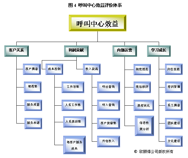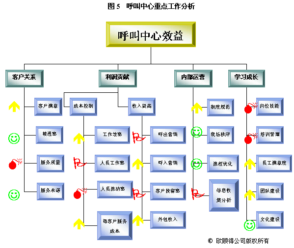 根據(jù)年度重點工作及目標,我們就可以設(shè)計關(guān)鍵措施來使其實現(xiàn)。通常一項關(guān)鍵措施可以有助于幾個目標的達成。如建立培訓體系,可以使得在崗培訓、上崗培訓、多技能訓練以及崗位技能達標率有所提升,而體現(xiàn)在業(yè)務(wù)上的效果則是服務(wù)質(zhì)量的提升、呼出營銷收入增加和客戶挽留率提高。