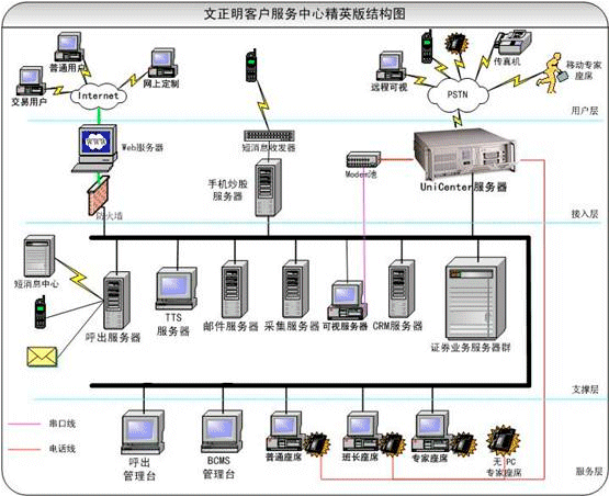泰陽證券有客戶2萬多,相當(dāng)一部分要通過電話委托程序作交易。原有電話委托系統(tǒng)是模擬線。交易忙時,很多股民打不進(jìn)去。以前的業(yè)務(wù)相對也比較簡單。文正明公司在了解了泰陽方面的業(yè)務(wù)需要后,用公司的UniCenter系統(tǒng)和深圳東進(jìn)公司的ISDN數(shù)字卡、傳真卡和座席卡,為泰陽搭建了一個新的語音應(yīng)用平臺。