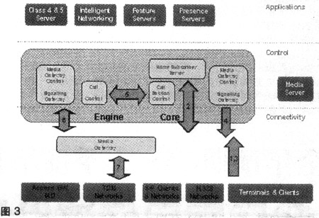 連接層由3個(gè)關(guān)鍵部分組成:用戶(hù)設(shè)備、媒體網(wǎng)關(guān)和IP傳輸。ENGINE解決方案的媒體網(wǎng)關(guān)可以支持從很小數(shù)量的用戶(hù)擴(kuò)展到數(shù)百萬(wàn)用戶(hù)。本地交換機(jī)、匯接交換機(jī)和用戶(hù)交換機(jī)可以接入到媒體網(wǎng)關(guān)。多媒體用戶(hù)可通過(guò)SIP終端和IAD接入。ENGINE支持采用V5、ISUP、SIP和H.248等各種接入節(jié)點(diǎn)的用戶(hù)。在ENGINE解決方案中,媒體網(wǎng)關(guān)同時(shí)也是接入網(wǎng)關(guān),可以實(shí)現(xiàn)C5電話業(yè)務(wù)和基于SIP的寬帶用戶(hù)功能。