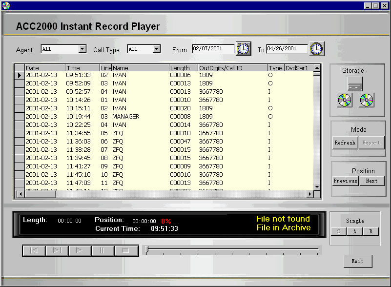 ACC2000 多媒體溝通中心采用最先進的海量存儲設備DVD RAM構建實時多通道語音錄制、備份系統(tǒng)��ACC2000 DVD Record Backup。這個系統(tǒng)可以根據(jù)管理員設定的錄音對象,對符合錄音條件的通話自動進行錄音!