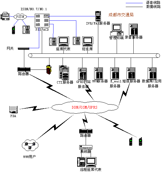 根據(jù)成都市交通局智能交通信息平臺的要求,系統(tǒng)的建設(shè)規(guī)模為:30路IVR,8個人工座席,呼叫中心接入中繼數(shù)60路。智能交通信息平臺以AVAYA Definity G3si為PBX、青牛USE為CTI、青牛ATS為IVR作為基礎(chǔ)平臺,能夠支持WEB訪問、電話呼入/呼出、傳真收發(fā)、E_mail等多種訪問手段。