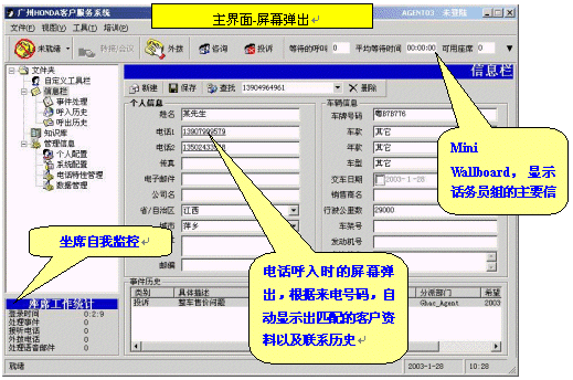 當(dāng)客戶的電話被轉(zhuǎn)到客戶服務(wù)人員時,客戶的所有相關(guān)信息將自動彈出顯示在服務(wù)人員的電腦屏幕上,包括歷史接觸記錄信息等,這樣就能提供最具有針對性和高效率的服務(wù)。如果是新客戶,那么服務(wù)人員將即時錄入信息,動態(tài)擴充數(shù)據(jù)庫。