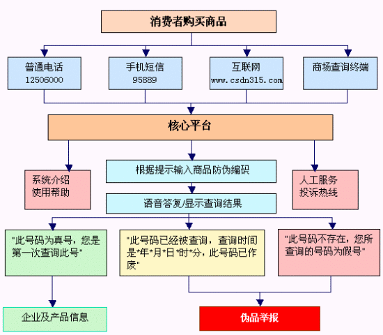 通過登錄www.csdn315.com,進行商品真?zhèn)蔚牟樵儯瑫r可以等到商品許多有用的相關信息。通過網(wǎng)站還將獲取防偽的相關資訊、購物指導性建議、國家有關的防偽法律知識;