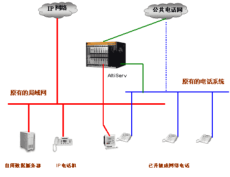 員工的電話有兩種選擇,一是傳統(tǒng)的模擬電話,以傳統(tǒng)的交換機布線方式,接普通的模擬電話線(雖然外表一樣,但它其實已經(jīng)是從Altiserv接出的網(wǎng)絡(luò)電話)。二是采用IP數(shù)字電話,以網(wǎng)線方式插入局域網(wǎng)的端口或集線器。在辦公室內(nèi)使用IP數(shù)字電話和普通模擬電話沒有多大的區(qū)別;兩種電話還可以在一個Altiserv下同時使用。