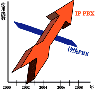 "2005年IP-PBX的使用線數(shù)將超過(guò)傳統(tǒng)PBX。從2001年開始傳統(tǒng)PBX以每年12%的速度在下降,IP-PBX以每年30%的速度增長(zhǎng)"。