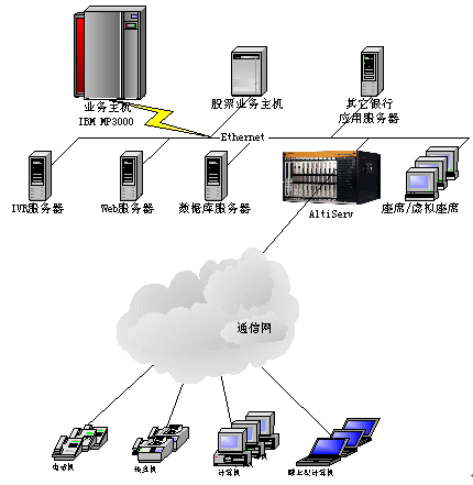 。。目標是建立一個功能完善的客戶服務(wù)中心,涵蓋自動語音應(yīng)答(IVR)、人工座席、WEB呼叫、客戶資料查詢統(tǒng)計以及與現(xiàn)有的銀行其他業(yè)務(wù)系統(tǒng)的結(jié)合。整個系統(tǒng)采用奧迪堅呼叫中心系統(tǒng)AltiCenter,系統(tǒng)以一個特定號碼xxxxx作為呼叫中心的系統(tǒng)號碼(也可提供多個電話號碼),集中受理客戶的業(yè)務(wù)需求,為客戶提供綜合性服務(wù)。它能與Internet、資料庫系統(tǒng)很好地集成,實現(xiàn)資料共用和各種其他不同的業(yè)務(wù)功能。