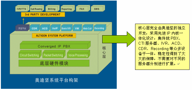 值得一提的是,在穩(wěn)定性上,奧迪堅(jiān)IP一體化呼叫中心平臺(tái)系統(tǒng)構(gòu)架,從產(chǎn)品設(shè)計(jì)之初就突破了以住基于交換機(jī)或板卡的傳統(tǒng)模式,在一臺(tái)通訊服務(wù)器上高度融合了呼叫中心的所有常用功能,有效避免了復(fù)雜的網(wǎng)絡(luò)連接和眾多的各類(lèi)交換機(jī)和外掛設(shè)備,各個(gè)設(shè)備相對(duì)獨(dú)立兼容性差所給呼叫中心系統(tǒng)所帶的穩(wěn)定性欠佳的隱患。除此之外,奧迪堅(jiān)呼叫中心系統(tǒng)底層硬件模塊是在美國(guó)設(shè)計(jì)生產(chǎn)的,通過(guò)北美和中國(guó)的嚴(yán)格的電信入網(wǎng)測(cè)試;相對(duì)于硬件,平臺(tái)軟件也都是由奧迪堅(jiān)自主開(kāi)發(fā)設(shè)計(jì)的,針對(duì)不同的硬件采用不同的驅(qū)動(dòng)模塊,軟硬一體在交換層又使用統(tǒng)一的邏輯接口,結(jié)構(gòu)清晰,層次合理,不僅保障了穩(wěn)定而且便于擴(kuò)展(如下圖所示),整個(gè)系統(tǒng)作為一個(gè)整體統(tǒng)一擴(kuò)展,不需要對(duì)不同的服務(wù)器分別進(jìn)行擴(kuò)展,有效避免了傳統(tǒng)呼叫中心構(gòu)建方式在擴(kuò)展方面存在的復(fù)雜性問(wèn)題以及高額的擴(kuò)展費(fèi)用。