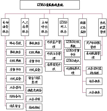 系統(tǒng)主要功能有:事故報(bào)告、打假舉報(bào)、質(zhì)量申訴、行風(fēng)監(jiān)督、業(yè)務(wù)咨詢、防偽查詢、主動呼出、網(wǎng)上服務(wù)、統(tǒng)計(jì)分析、數(shù)據(jù)匯總監(jiān)控等。