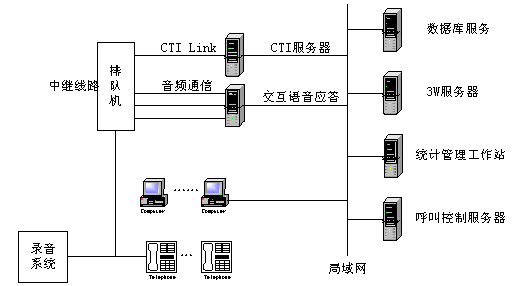 ACD方式即前置交換機(jī)+語音服務(wù)器,即在專用交換機(jī)+ACD(自動(dòng)話務(wù)分配)的基礎(chǔ)上擴(kuò)展功能,用CTI技術(shù)實(shí)現(xiàn)通信和計(jì)算機(jī)的功能結(jié)合,并配以必要的語音和數(shù)據(jù)庫系統(tǒng)。