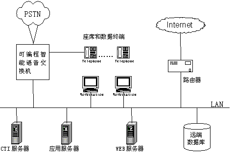 新一代呼叫中心主要由可編程智能語音交換機(jī)、業(yè)務(wù)代表座席、CTI服務(wù)器、