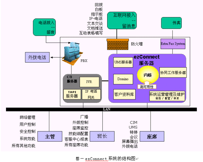 ezConnect系統(tǒng)是由訊泰信息科技公司的北京研發(fā)中心設(shè)計(jì)開(kāi)發(fā)出來(lái)的一個(gè)成熟的多媒體呼叫中心產(chǎn)品。支持傳統(tǒng)電話、web、電子郵件、傳真、語(yǔ)音郵件、IP電話、短消息、WAP等用戶接入方式;對(duì)客戶請(qǐng)求采用基于座席技能的智能分派;提供文本交談、白板共享、協(xié)同填表、文檔推送、IP電話、短消息發(fā)送等多種實(shí)時(shí)交流工具;有非常實(shí)用的實(shí)時(shí)監(jiān)控和報(bào)表子系統(tǒng)。核心部分的設(shè)計(jì)采用分離分層的思想,實(shí)現(xiàn)了相對(duì)于PBX、IVR、CRM的透明性。系統(tǒng)的配置非常靈活,可以在很短的時(shí)間內(nèi)完全改變整個(gè)客戶端的風(fēng)格,或支持一種新的語(yǔ)言。整個(gè)系統(tǒng)建立在Java平臺(tái)上,具有良好的可移植性。下面是ezConnect系統(tǒng)的結(jié)構(gòu)圖:
