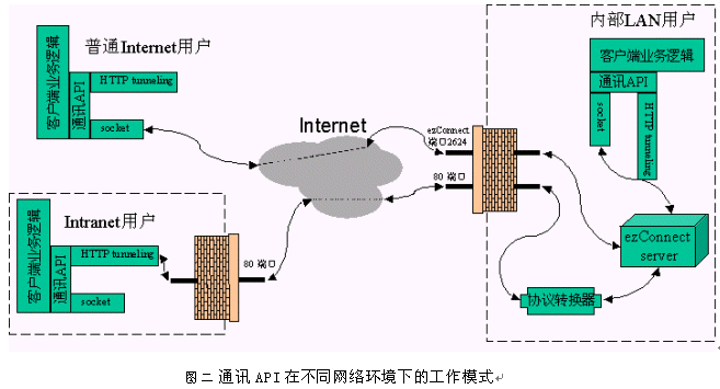 普通Internet用戶(例如撥號(hào)上網(wǎng)或小區(qū)ADSL)對(duì)Internet資源的訪問(wèn)一般不受限制,所以只需解決如何穿越保衛(wèi)著ezConnect服務(wù)器的防火墻的問(wèn)題。訊泰公司的方案是開(kāi)發(fā)一套通用的通訊API, 在此API的基礎(chǔ)上實(shí)現(xiàn)呼叫中心客戶端的業(yè)務(wù)邏輯(參見(jiàn)下圖)。這個(gè)通訊API的底層有兩種方式:直接socket連接和HTTP隧道,API會(huì)自動(dòng)檢測(cè)其所處的網(wǎng)絡(luò)環(huán)境來(lái)選擇適當(dāng)?shù)牡讓舆B接方式。一般而言,保障著ezConnect服務(wù)器的防火墻應(yīng)該開(kāi)放著ezConnect的協(xié)議端口2624。 所以普通Internet用戶訪問(wèn)ezConnect系統(tǒng)時(shí),客戶端軟件與服務(wù)器軟件通過(guò)建立直接的socket連接來(lái)互通信息。目標(biāo)3由此達(dá)到。