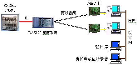 DAS120與億景座席卡MAC配合使用,可使系統(tǒng)的優(yōu)越性發(fā)揮到最大。MAC卡提供的強(qiáng)大功能(收發(fā)DTMF和450HZ信號(hào)音,語音錄放等)有效地簡(jiǎn)化系統(tǒng)軟件的設(shè)計(jì),并可降低系統(tǒng)成本,如EXCEL交換機(jī)可不用配置DSP卡,IVR可簡(jiǎn)化等。還可以有效地降低交換機(jī)的處理負(fù)荷,提高話務(wù)處理能力。