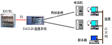 見下圖:DAS120主機(jī)通過4個(gè)E1接口與交換機(jī)直接連接,可方便地實(shí)現(xiàn)本地座席接入。遠(yuǎn)端分布式接入則需要通過傳輸設(shè)備,它們可為光纖,微波,HDSL等。終端可為座席卡和電話機(jī)。