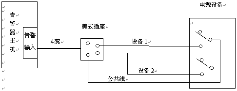 電源、UPS設備的告警信號從告警器后面板告警輸入接口輸入,通過四蕊電話線相連。一臺主機可收集五種告警。連接距離可達5公里。