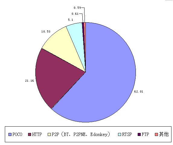 - 監(jiān)控時間段內(nèi),POCO流量占62.01%,HTTP占21.16%,RTSP(在線視頻)占5.1%,P2P業(yè)務(wù)(包括EDonkey、P2PNE、BT等)占10.53%,F(xiàn)TP為0.61%,其他業(yè)務(wù)不到0.59%。如下圖: