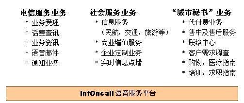InfOnCall語音服務(wù)平臺(tái)應(yīng)用于電信服務(wù)業(yè),能為運(yùn)營商提供相當(dāng)廣的業(yè)務(wù)范圍。