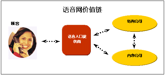許多語音入口提供商向個人和公司提供語音網(wǎng)上的服務(wù),而內(nèi)容和結(jié)構(gòu)公司則向這些入口提供商提供技術(shù)支持、產(chǎn)品和主機服務(wù)。