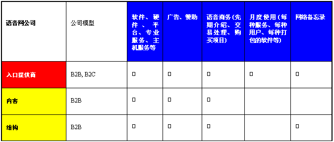 “第一個吃螃蟹”的公司僅僅注重提供語音入口服務(wù),語音網(wǎng)使這些公司有機會通過電話經(jīng)營互聯(lián)網(wǎng)商務(wù)模型。