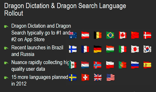 當(dāng)然,Nuance自己也開發(fā)面向大眾消費者的語音控制軟件,包括Dragon Dictation、Dragon TV、Dragon Search、及Dragon Go!等。目前已有上億部智能手機(jī)、車載導(dǎo)航系統(tǒng)等裝置采用了Nuance的語音軟件,三星、諾基亞、摩托羅拉、HTC、福特、寶馬、大眾、奧迪等公司都是Nuance的合作伙伴,每一部采用其聲控軟件的智能手機(jī)和裝載了其聲控導(dǎo)航的汽車,都將向Nuance繳納一定的授權(quán)使用費。