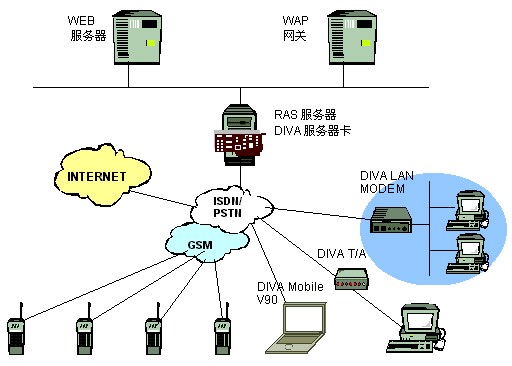 DIVA服務(wù)器卡由BRI,4BRI,PRI/T1/E1等型號(hào),通過(guò)不同組合每個(gè)服務(wù)器可以并行支持2到120路傳真話音業(yè)務(wù),可應(yīng)答或呼叫ISDN設(shè)備,模擬話機(jī)傳真和GSM設(shè)備,是提供 RAS服務(wù),組建WAP站點(diǎn),提供FAX Server和UMS服務(wù)的較為理想設(shè)備。
