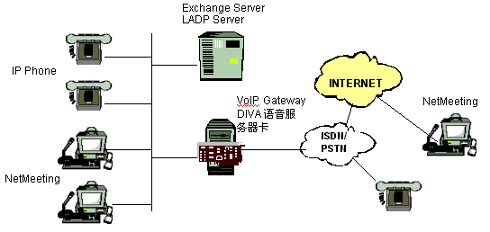 VoIP Gateway:可以通過(guò)使用LDAP(Lightweight Directory Access Protocol)來(lái)實(shí)現(xiàn) SoftPBX。 LDAP可以讓應(yīng)用程序來(lái)訪問(wèn)目錄信息,比如可以從目錄中數(shù)據(jù)庫(kù)中訪問(wèn)用戶的 電子郵件地址,電話號(hào)碼等。 DIVA VoIP 網(wǎng)關(guān)服務(wù)器也包含完整的語(yǔ)音郵件服務(wù)器。 用于進(jìn)行地址解析的Exchange服務(wù)器同樣也可以進(jìn)行語(yǔ)音郵件的轉(zhuǎn)發(fā)。當(dāng)任何終端沒(méi)有回答呼入呼叫時(shí)DIVA VoIP 網(wǎng)關(guān)服務(wù)器可以播放一段問(wèn)候語(yǔ)然后錄下你的留言。被錄下的語(yǔ) 音留言將做為電子郵件的附件被傳送到被叫用戶的電子郵箱中。