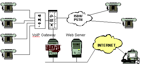 DIVA語(yǔ)音服務(wù)器解決方案通過(guò)將公司的網(wǎng)頁(yè)直接同呼叫中心相連方法可以增強(qiáng)呼叫中心的功能。為了讓用戶知道可以直接連接,公司可以將Call-Me(呼叫我)按扭放在他的的網(wǎng)頁(yè) 上。當(dāng)用戶點(diǎn)擊這一按扭時(shí),VoIP的應(yīng)用程序,比如NetMeeting,將自動(dòng)地在他們的計(jì)算機(jī)中啟動(dòng)。這個(gè)應(yīng)用程序?qū)⒋蜷_(kāi)同DIVA VoIP 網(wǎng)關(guān)服務(wù)器的連接,然后再由網(wǎng)關(guān)連接到 PSTN,即可以同呼叫中心的代理進(jìn)行正常的電話連接。