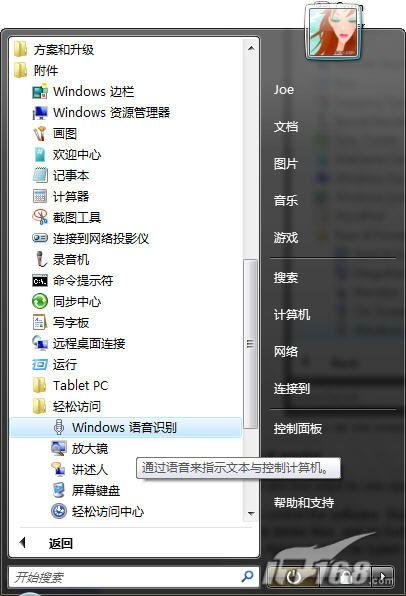 如圖2所示,你也可以在“所有程序|附件|輕松訪問”菜單下找到語音識別特性。圖2 在“輕松訪問”菜單中,你也能看到“語音識別”