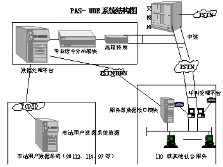 為了滿足各類社會應(yīng)急與服務(wù)呼叫系統(tǒng)對電話用戶資料的需要,同時又解決電信部門對用戶資料數(shù)據(jù)庫的保密和安全要求,我公司成功開發(fā)了PAS-UDE(User Data Extract)電話信息回送系統(tǒng),并成為110聯(lián)網(wǎng)接口設(shè)備開發(fā)生產(chǎn)入網(wǎng)廠商。