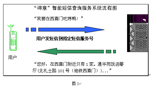 智能短信服務(wù),就是允許短信用戶在手機(jī)上直接以自然語言的形式輸入文字(而不是輸入復(fù)雜的代碼或操作繁瑣的菜單),系統(tǒng)能迅速、準(zhǔn)確地理解用戶的意思,提供周到的信息和服務(wù)。短信服務(wù)商可根據(jù)具體應(yīng)用領(lǐng)域定制一系列全新的智能短信業(yè)務(wù),如旅游交通、餐飲娛樂、金融證券、交友網(wǎng)聚、智力競(jìng)猜等受歡迎的服務(wù),將直接刺激用戶使用短信服務(wù)的興趣和頻率。得意公司提供的北京餐飲智能短信服務(wù)可以靈活、方便地引導(dǎo)用戶找到合適的餐飲信息(圖1)