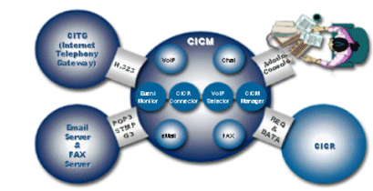CICM是ITI解決方案中的核心模塊,該模塊完成系統(tǒng)涉及到互聯(lián)網(wǎng)的所有通話的控制,包括VOIP、E-mail、Chatting、畫像通話等。而該模塊與CICR的連動(dòng)正是完成CTI和ITI技術(shù)完美結(jié)合的關(guān)鍵。即當(dāng)一個(gè)網(wǎng)上呼叫呼入時(shí),由CICR返回所分配的話務(wù)員相關(guān)信息(如:IP),然后CICM將該信息送給客戶使得網(wǎng)絡(luò)聊天和WEB到電話的通話得以同步。而CCPM 部分也可以對(duì)WEB相關(guān)的呼叫進(jìn)行實(shí)時(shí)監(jiān)視。