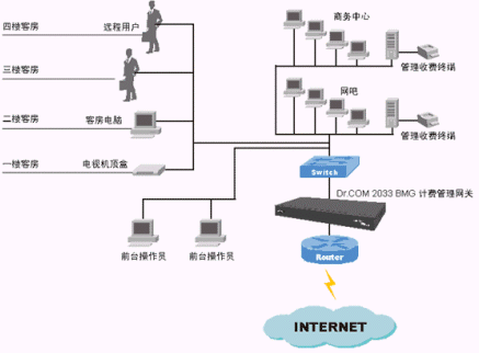 這是一個全面的方案。一方面通過五類雙絞線(即以太網(wǎng),也可通過機頂盒或ADSL)將整個酒店的客房、網(wǎng)吧甚至酒店內(nèi)部網(wǎng)絡(luò)系統(tǒng)以一定的安全手段(如VLAN)聯(lián)成一個局域網(wǎng),另一方面用路由器通過DDN、ADSL等高速線路連接到Internet,兩者之間就是Dr.COM 2033BMG管理計費網(wǎng)關(guān)。