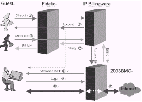 本方案將Dr.COM計費系統(tǒng)作為一個部件嵌入到酒店現(xiàn)有的管理軟件系統(tǒng)里。這樣做的好處是酒店經(jīng)營者不必面對兩套系統(tǒng)。