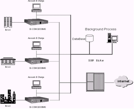 Dr.COM 2033BMG充當(dāng)驗證計費服務(wù)器的角色。它接受"前臺用戶結(jié)算終端"開設(shè)的住客賬戶,在住客撥號登入時核對住客賬號,實時地把住客上網(wǎng)的時間流量等信息返回給"前臺用戶結(jié)算終端",由后者按預(yù)定的計費策略對住客收費。