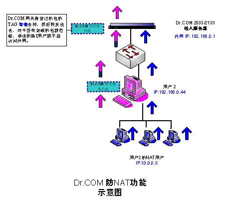 共享合法用戶的身份的NAT用戶,由于他們發(fā)出的數(shù)據(jù)包是沒有經(jīng)過封裝的,雖然經(jīng)過合法用戶的電腦實現(xiàn)了地址轉(zhuǎn)換,但Dr.COM的防代理客戶端不會對這些NAT用戶的數(shù)據(jù)包進行封裝,所以這些數(shù)據(jù)包就在網(wǎng)關(guān)被過濾掉,代理用戶就不能正常上網(wǎng)。